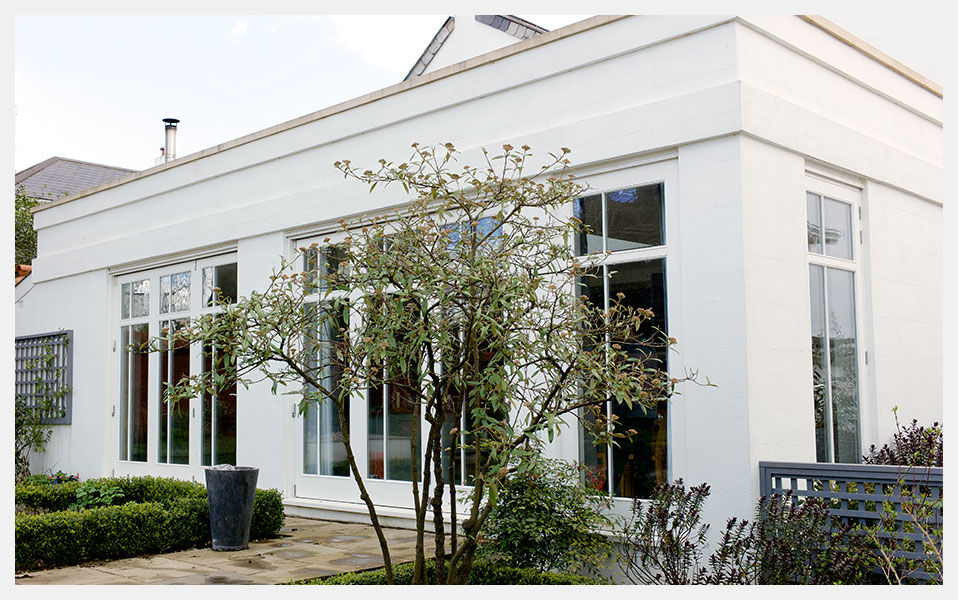 Design: An "Orangerie" style of design was chosen to achieve a good balance between the functional use of the space and its proportions. Painted glazed timber doors and windows set within rendered walls were used instead of upvc and glass. The roof was replaced with a flat roof, hidden behind a parapet with a large, central roof lantern. This improved on the design of the existing conservatory whose use was limited and whose design was unsympathetic in the context of the listed building.